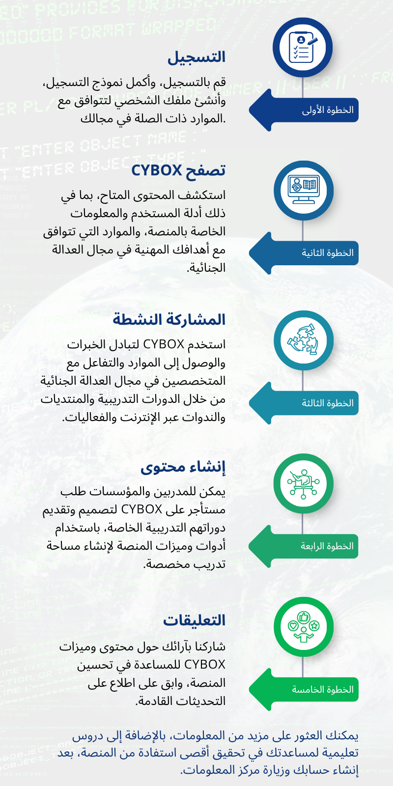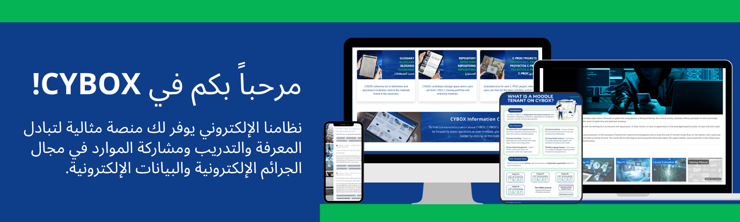 مرحبًا بكم في CYBOX – منصتكم الإلكترونية للتبادل والتدريب ومشاركة الموارد في مجال الجرائم الإلكترونية والأدلة الإلكترونية.